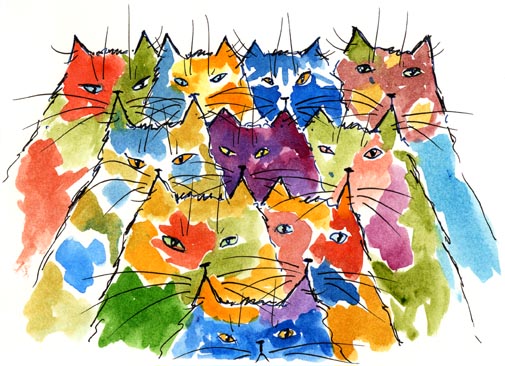 Ear to Chin Will Make You Grin Art Card of an original Drew Strouble cat art watercolor painting of whimsical and colorful cartoon cats whose mouths and ears are artistically arranged to complement each other. Fine Art Greeting Card. Hand mounted Art Print on 5" x 7" white card. Blank inside. Matching envelope and clear protective packet included.
