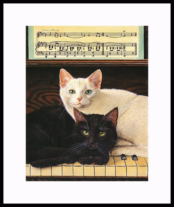 Ebony and Ivory Framed Limited Edition of an original Drew Strouble cat art watercolor painting of a black cat and a white cat on a piano. Limited Edition of: 950 Prints. Overall size: 14" x 16 3/8" incl. 2 1/2" mat. I Each print is hand signed, titled & numbered with matching Certificate of Authenticity. All prints are shrink wrapped with a white mat and foamcore backing. Designer Frames are black aluminum with plexiglas.