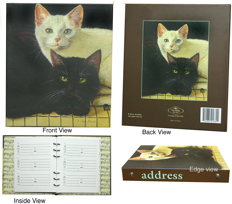 Drew Strouble's CatmanDrew Ebony and Ivory Address Book 6 1/4" x 7 1/8", produced by Pine Ridge Art, Inc. This fabulous address book will make the purrfect gift for a friend, including yourself! Click on the image to the left to view a larger picture and more detail. I've shown four different photos of the address book for your viewing pleasure. They will give you a good idea what it looks like in real life.