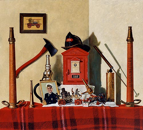 Embers Open Edition Matted Mini Print of an original Drew Strouble Trompe l'Oeil Still Life Oil Painting honoring the lifetime career of a professional firefighter. Open Edition Mini Prints. Overall size: 9" x 9 3/4" incl. 2" mat. Each print is hand signed and titled. All prints are shrink wrapped with a white mat and foamcore backing.