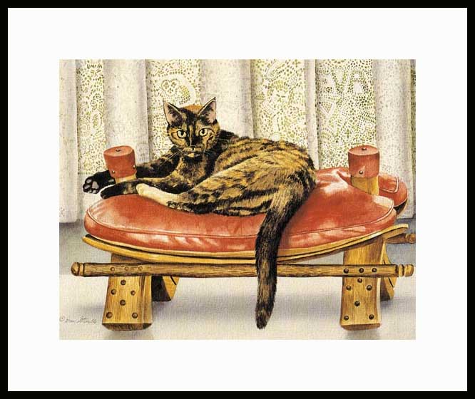 Eva Framed Artist's Proof of an original Drew Strouble cat art watercolor painting of a Tortoise Shell cat. Limited Edition of:50 Artist's Proofs. Overall size: 14" x 16 3/8" incl. 2 1/2" mat.I Each print is hand signed, titled & numbered with matching Certificate of Authenticity. All prints are shrink wrapped with a white mat and foamcore backing. Designer Frames are black aluminum with plexiglas.