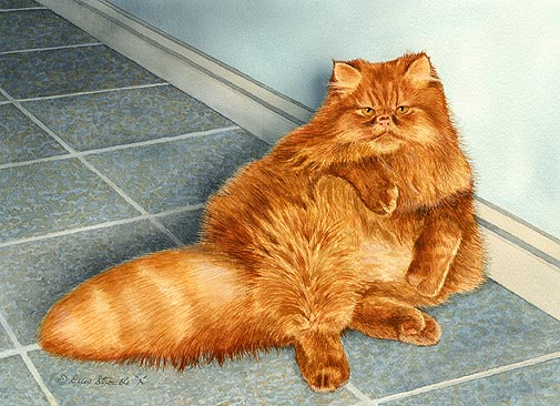 Fat Boy Matted Open Edition Mini Print of an original Drew Strouble cat art watercolor painting of a fat red Persian cat. Open Edition Mini Prints. I Overall size: 9 3/4" x 11 5/8" incl. 2" mat. I Each print is hand signed and titled. All prints are shrink wrapped with a white mat and foamcore backing.