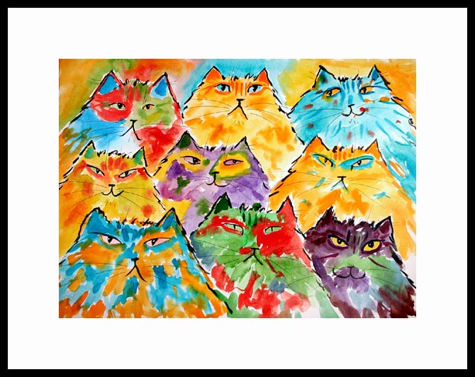 Feline Fiesta III Framed Artist's Proof of an original Drew Strouble cat art watercolor painting of a Feline Fiesta of whimsical and colorful cartoon cats. Limited Edition of: 50 Artist's Proofs. Overall size: 14 1/2" x 18" incl. 2 1/2" mat. Each print is hand signed, titled & numbered with matching Certificate of Authenticity. All prints are shrink wrapped with a white mat and foamcore backing. Designer Frames are black aluminum with plexiglas.