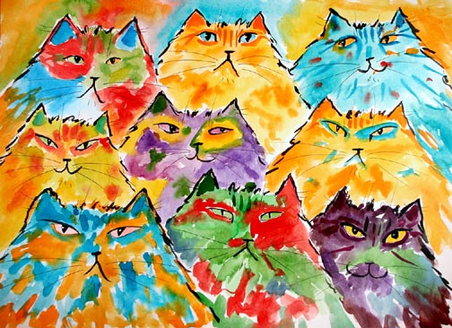 Feline Fiesta III Matted Artist's Proof of an original Drew Strouble cat art watercolor painting of a Feline Fiesta of whimsical and colorful cartoon cats. Limited Edition of: 50 Artist's Proofs. Overall size: 14 1/2" x 18" incl. 2 1/2" mat. Each print is hand signed, titled & numbered with matching Certificate of Authenticity. All prints are shrink wrapped with a white mat and foamcore backing.