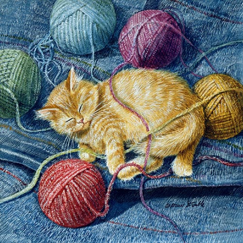 Fuzzball Matted Artist's Proof of an original Drew Strouble cat art watercolor painting of a little orange tabby kitten is all tangled up and all tuckered out with a ball of yarn. Limited Edition of: 50 Artist's Proofs. Overall size: 18" x 18" incl. 2 3/4" mat. Each print is hand signed, titled & numbered with matching Certificate of Authenticity. All prints are shrink wrapped with a white mat and foamcore backing.