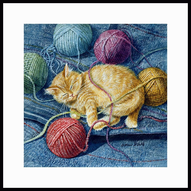 Fuzzball is an original Drew Strouble cat art watercolor painting of a little orange tabby kitten is all tangled up and all tuckered out with a ball of yarn, available as a print in several sizes, matted or framed.Fuzzball<br>by Drew StroubleFuzzball