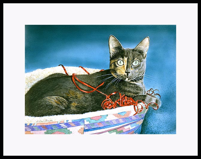 Game Over! Framed Artist's Proof of an original Drew Strouble cat art watercolor painting of a dilute calico tortoise shell cat playing with a ribbon. Limited Edition of: 50 Artist's Proofs. Overall size: 14 1/2" x 18" incl. 2 1/2" mat. Each print is hand signed, titled & numbered with matching Certificate of Authenticity. All prints are shrink wrapped with a white mat and foamcore backing. Designer Frames are black aluminum with plexiglas.