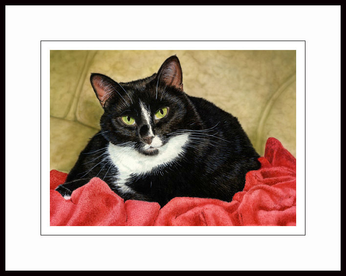 Framed Limited Edition of an original Drew Strouble cat art painting of a wonderfully detailed large domestic bi-color black and white cat. Limited to 950 Prints. Overall size Approx.: 20" x 24" incl. 3 1/2" mat. Each print is hand signed, titled & numbered with matching Certificate of Authenticity. All prints are shrink wrapped with a white mat and foamcore backing. Black frames are high quality extruded anodized aluminum with plexiglas for safe shipping.