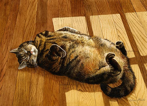 Ginger Matted Limited Edition of an original Drew Strouble cat art watercolor painting of a fat Tabby cat sleeping in the sun. Limited Edition of: 950 Prints. Overall size: 14 1/2" x 18" incl. 2 1/2" mat. Each print is hand signed, titled & numbered with matching Certificate of Authenticity. All prints are shrink wrapped with a white mat and foamcore backing.