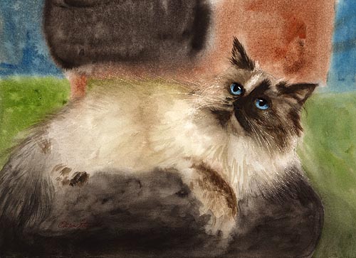 Glamour Puss Matted Limited Edition of an original Drew Strouble cat art watercolor painting of a Tortie Point Himalayan or Pointed Persian cat. Limited Edition of: 950 Prints. Overall size: 14 1/2" x 18" incl. 2 1/2" mat. Each print is hand signed, titled & numbered with matching Certificate of Authenticity. All prints are shrink wrapped with a white mat and foamcore backing.