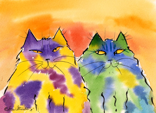 HAPPY COUPLE (color version) - Matted Artist's Proof of an original Drew Strouble cat art painting of wonderfully whimsical and very colorful cats. Limited Edition of: 50 Artist's Proofs. Overall size: 14 1/2" x 18" incl. 2 1/2" mat. Each print is hand signed, titled & numbered with matching Certificate of Authenticity. All prints are shrink wrapped with a white mat and foamcore backing.