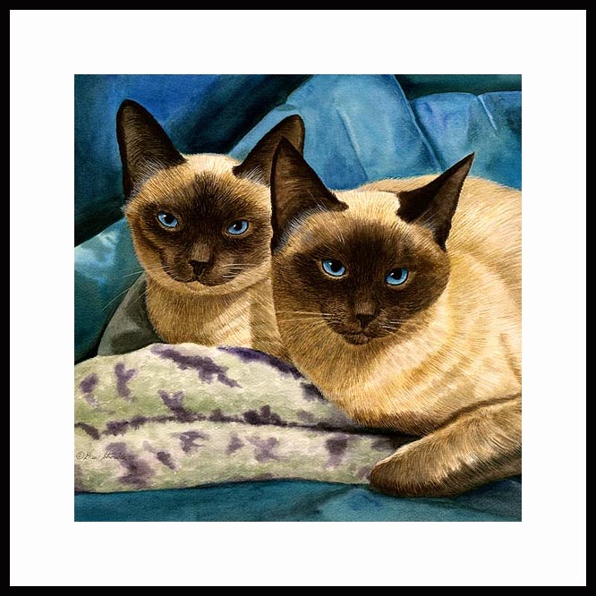 Hansel and Gretel Framed Open Edition Mini Print of an original Drew Strouble cat art watercolor painting of a 2 cuddling Seal Point Siamese Cats. Open Edition Mini Prints. Overall size: 10" x 10" incl. 1 1/2" mat. Each print is hand signed and titled.All prints are shrink wrapped with a white mat and foamcore backing. Designer Frames are black aluminum with plexiglas.