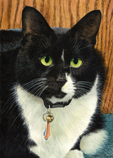Matted Mini Print of an original Drew Strouble cat art painting of a wonderfully detailed black and white cat named Harry. Overall size 9 3/4 x 11 5/8 inches. Hand signed and titled by the artist. White mat, foamcore backing all shrink wrapped and ready for framing.