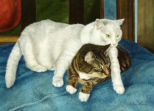 Heads Up! Matted Open Edition Mini Print of an original Drew Strouble cat art watercolor painting of a White Cat and a Tabby Cat. Open Edition Mini Prints. Overall size: 9 3/4" x 11 5/8" incl. 2" mat. Each print is hand signed and titled. All prints are shrink wrapped with a white mat and foamcore backing.