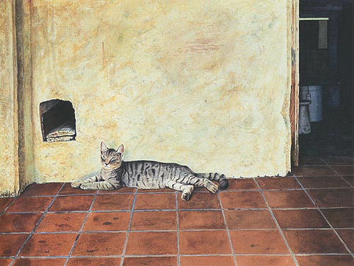 Helga's Cat Card of an original Drew Strouble cat art watercolor painting of a Gray Tabby Cat in tribute to Andrew Wyeth. Fine Art Greeting Card. Hand mounted Art Print on 5" x 7" white card. Blank inside. Matching envelope and clear protective packet included.