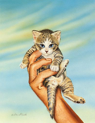 He's a Handful Matted Artist's Proof of an original Drew Strouble cat art watercolor painting of a Tabby Kitten being held by a hand. Limited Edition of: 50 Artist's Proofs. Overall size: 14" x 16 3/8" incl. 2 1/2" mat. Each print is hand signed, titled & numbered with matching Certificate of Authenticity. All prints are shrink wrapped with a white mat and foamcore backing.