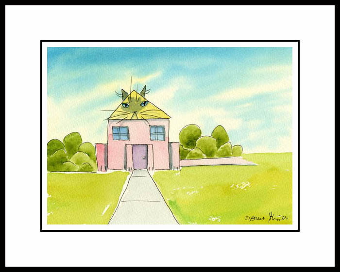 Framed Open Edition Mini print of an original Drew Strouble cat art painting of wonderfully whimsical and very colorful cats. Overall size: 9 3/4" x 11 5/8" incl. 2" mat. Each print is hand signed and titled. All prints are shrink wrapped with a white mat and foamcore backing. Black frames are high quality extruded anodized aluminum with plexiglas for safe shipping.
