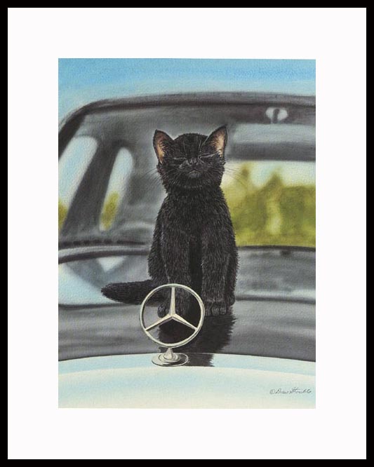 Home, James! Framed Artist's Proof of an original Drew Strouble cat art watercolor painting of a Black Kitten on a Mercedes Benz, available as a print in several sizes. Limited Edition of: 50 Artist's Proofs. Overall size: 14 1/2" x 18" incl. 2 1/2" mat. Each print is hand signed, titled & numbered with matching Certificate of Authenticity. All prints are shrink wrapped with a white mat and foamcore backing. Designer Frames are black aluminum with plexiglas.