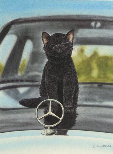 Home, James! Card of an original Drew Strouble cat art watercolor painting of a Black Kitten on a Mercedes Benz, available as a print in several sizes. Fine Art Greeting Card. Hand mounted Art Print on 5" x 7" white card. Blank inside. Matching envelope and clear protective packet included.