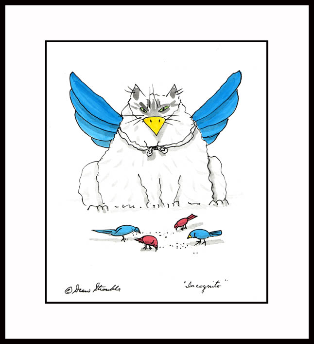 Framed Open Edition Mini print of an original Drew Strouble cat art painting of wonderfully whimsical and very colorful cats. Overall size: 9 3/4" x 11 5/8" incl. 2" mat. Each print is hand signed and titled. All prints are shrink wrapped with a white mat and foamcore backing. Black frames are high quality extruded anodized aluminum with plexiglas for safe shipping.