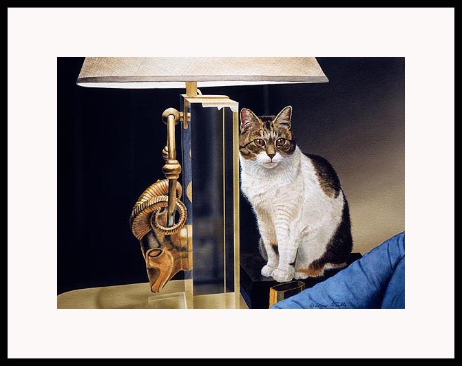 In the Den Framed Limited Edition of an original Drew Strouble cat art watercolor painting of a Tabby Calico Cat mix. Limited Edition of: 950 Prints. Overall size: 14 1/2" x 18" incl. 2 1/2" mat. Each print is hand signed, titled & numbered with matching Certificate of Authenticity. All prints are shrink wrapped with a white mat and foamcore backing. Designer Frames are black aluminum with plexiglas.