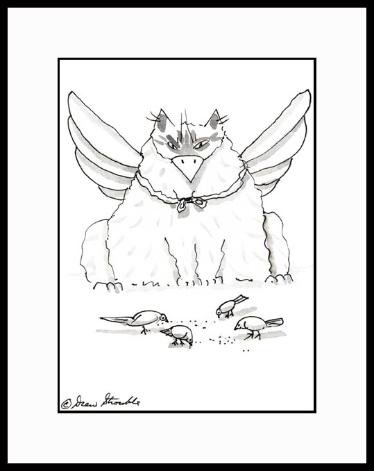 Incognito Framed Open Edition Mini Print of an original Drew Strouble brush & ink drawing cat cat cartoon of a cat disguised as a bird among birds. Open Edition Mini Prints. Overall size: 9 3/4" x 11 5/8" incl. 2" mat. Each print is hand signed and titled. All prints are shrink wrapped with a white mat and foamcore backing. Designer Frames are black aluminum with plexiglas.