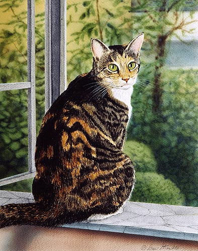 Inside Out Card of an original Drew Strouble cat art watercolor painting of a pretty Tabby Cat mix at her window perch. Fine Art Greeting Card. Hand mounted Art Print on 5" x 7" white card. Blank inside. Matching envelope and clear protective packet included.