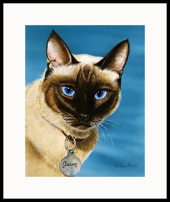 Jazzy Framed Limited Edition of an original Drew Strouble cat art watercolor painting of a gorgeous Seal Point Siamese Cat with sky-blue eyes. Limited Edition of: 950 Prints. Overall size: 14" x 16 3/8" incl. 2 1/2" mat. Each print is hand signed, titled & numbered with matching Certificate of Authenticity. All prints are shrink wrapped with a white mat and foamcore backing. Designer Frames are black aluminum with plexiglas.