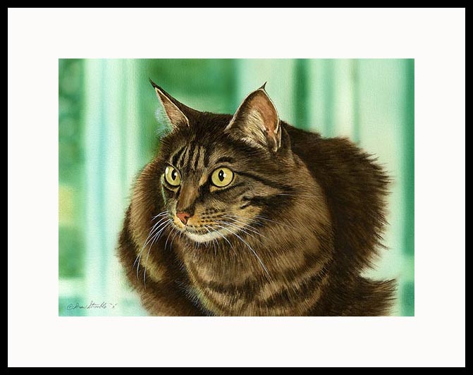 Justin Framed Open Edition Mini Print of an original Drew Strouble cat art watercolor painting of a classic brown tabby Maine Coon, available in fine art prints. Open Edition Mini Prints • Overall size: 9 3/4" x 11 5/8" incl. 2" mat. • Each print is hand signed and titled. All prints are shrink wrapped with a white mat and foamcore backing. Designer Frames are black aluminum with plexiglas.