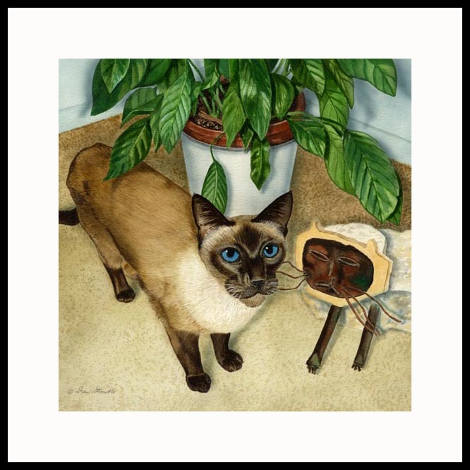 Jungle Boogie Framed Limited Edition Drew Strouble Siamese Cat Art of an original Drew Strouble cat art watercolor painting of a Rescued Seal Point Siamese Cat with leafy greens and a primitive cat sculpture. Limited Edition of: 950 Prints. Overall size: 18" x 18" incl. 2 3/4" mat. Each print is hand signed, titled & numbered with matching Certificate of Authenticity. All prints are shrink wrapped with a white mat and foamcore backing. Designer Frames are black aluminum with plexiglas.