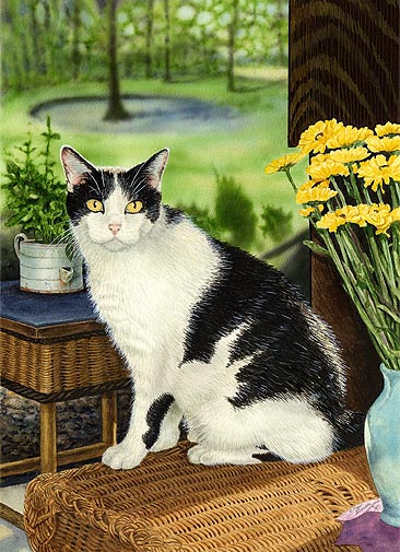 Kiki Matted Artist's Proof of an original Drew Strouble cat art watercolor painting of a black and white cat or domestic bicolor cat, with flowers and wicker, available in fine art prints. Limited Edition of: 50 Artist's Proofs • Overall size: 14 1/2" x 18" incl. 2 1/2" mat. • Each print is hand signed, titled & numbered with matching Certificate of Authenticity.All prints are shrink wrapped with a white mat and foamcore backing.