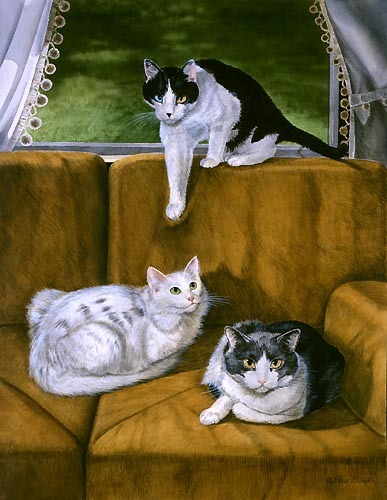 King of the Hill Matted Open Edition Mini Print of an original Drew Strouble cat art painting of a black-white cat, a spotted white cat and a gray-white tabby cat. Open Edition Mini Prints. Overall size: 9 3/4" x 11 5/8" incl. 2" mat. Each print is hand signed and titled. All prints are shrink wrapped with a white mat and foamcore backing.