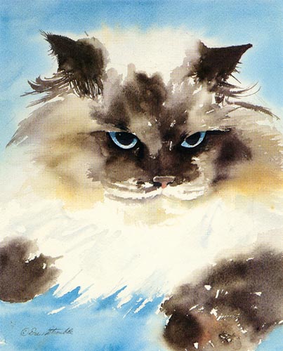 Lap Lion Matted Artist's Proof of an original Drew Strouble cat art watercolor painting of a Tortie-Point Himalayan Cat. Limited Edition of: 50 Artist's Proofs. Overall size: 14" x 16 3/8" incl. 2 1/2" mat. Each print is hand signed, titled & numbered with matching Certificate of Authenticity. All prints are shrink wrapped with a white mat and foamcore backing.