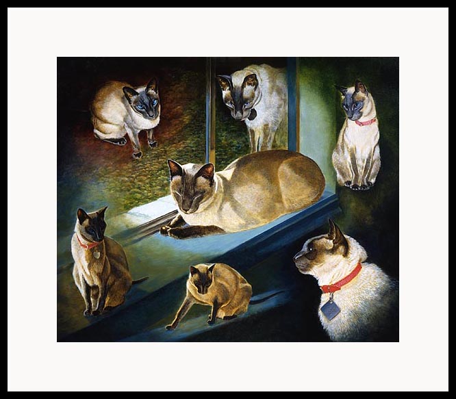 Ling Ling's Dream Framed Medium Open Edition of an original Drew Strouble cat art painting of the many moods of a beautiful rescued Siamese Cat. Open Edition Medium Prints ¥ 14 1/2" x 16" incl. 2 1/2" mat. ¥ Each print is hand signed and titled. All prints are shrink wrapped with a white mat and foamcore backing. Designer Frames are black aluminum with plexiglas.