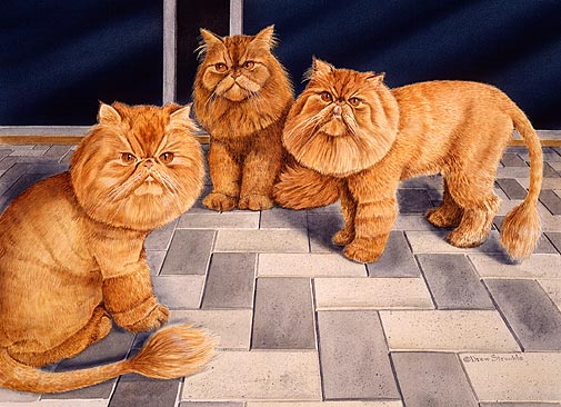 Lions on the Loose Framed Medium Open Edition of an original Drew Strouble cat art painting of three Red Persian cats sporting Lion Cuts. Open Edition Medium Prints ¥ Overall size: 14 1/2" x 18" incl. 2 1/2" mat. ¥ Each print is hand signed and titled. All prints are shrink wrapped with a white mat and foamcore backing. Designer Frames are black aluminum with plexiglas.