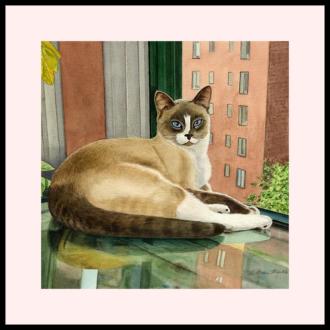 A striking New York City rescued Seal Point Snowshoe Siamese lounging sky high on a glass table top with a city high rise background.