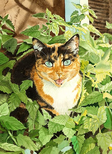 Looking for Me? Matted Open Edition Mini Print of an original Drew Strouble cat art watercolor painting of a calico cat in mid meow amidst outside greenery. Open Edition Mini Prints • Overall size: 9 3/4" x 11 5/8" incl. 2" mat. • Each print is hand signed and titled. All prints are shrink wrapped with a white mat and foamcore backing.