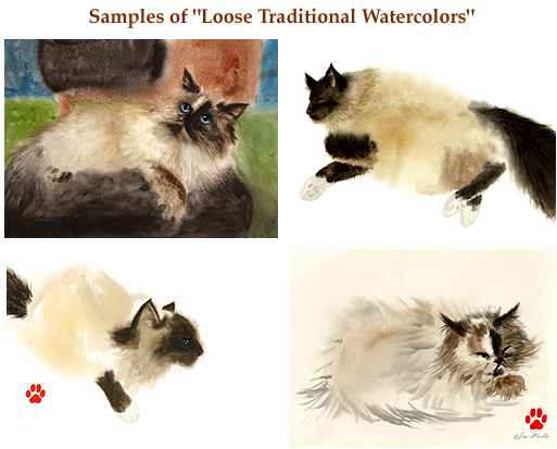 I will work from photos you provide. Not to worry, all your photos will be returned when I ship the finished painting to you. If possible, it's best if the photos are sharp focus, detailed, and shot in natural light without a flash (if possible). This avoids the problem of flat front light which eliminates alot of details and form. Flash photos may also cause "red eye" problems. It's very helpful to have one photo that you like for the pose and others that might be more accurate for eye and fur color, etc. A few close up shots are great for detail reference as well. I can alter the background if need be and combine references from different photos if necessary. A verbal description diffferent photos.