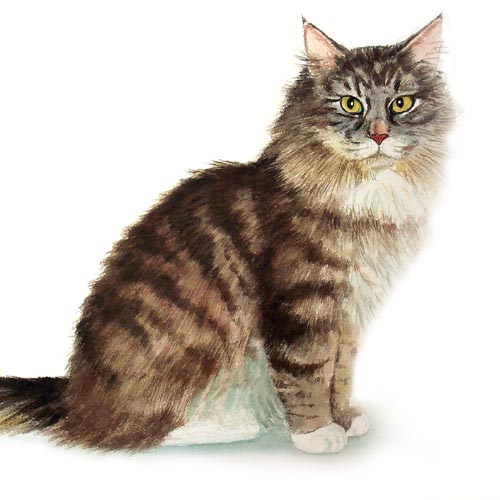 Maine Coon Limited Edition of an original Drew Strouble cat art watercolor painting of a classic brown tabby Maine Coon. Limited Edition of 950 Prints. Overall size: 18" x 18" incl. 2 3/4" mat. • Each print is hand signed, titled & numbered with matching Certificate of Authenticity. All prints are shrink wrapped with a white mat and foamcore backing.