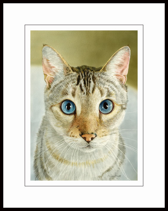 Framed Artist's Proof of an original Drew Strouble cat art painting of a wonderfully detailed Bengal Cat. Limited to 50 Artist's Proofs. Overall size Approx.: 14 1/2" x 18" incl. 2 1/2" mat. Each print is hand signed, titled & numbered with matching Certificate of Authenticity. All prints are shrink wrapped with a white mat and foamcore backing. Black frames are high quality extruded anodized aluminum with plexiglas for safe shipping.