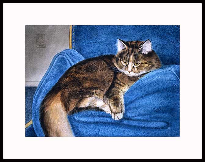 Mama Kitty Framed Open Edition Mini Print of an original Drew Strouble cat art watercolor painting of Maine Coon Cat cuddled up in a chair. Open Edition Mini Prints ¥ Overall size: 9 3/4" x 11 5/8" incl. 2" mat. ¥ Each print is hand signed and titled. All prints are shrink wrapped with a white mat and foamcore backing. Designer Frames are black aluminum with plexiglas.