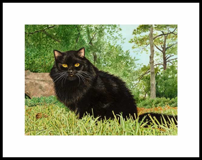 This stunningly beautiful, long haired, black cat is silhouetted against a backdrop of lush green forest. You can almost hear the gentle rustle of the leaves. This cat art print verison by Drew Strouble is a Framed Limited Edition with an overall size of 14 1/2" x 18" including a 2 1/2" white mat with a black beveled edge. Designer Frames are black aluminum with plexiglas. Edition of only 950 prints.