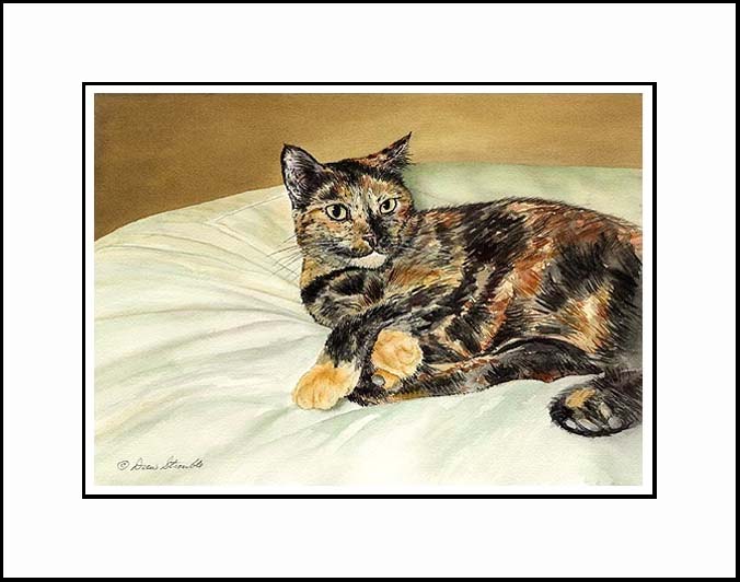 Mecca Matted Artist's Proof of an original Drew Strouble cat art watercolor painting of a Tortoise Shell cat. Limited Edition of: 50 Artist's Proofs. Overall size: 14 1/2" x 18" incl. 2 1/2" mat. Each print is hand signed, titled & numbered with matching Certificate of Authenticity. All prints are shrink wrapped with a white mat and foamcore backing.