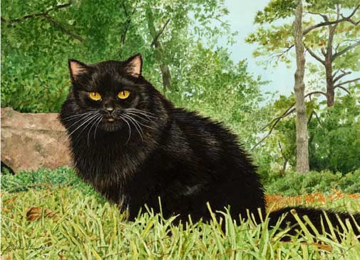 This stunningly beautiful, long haired, black cat is silhouetted against a backdrop of lush green forest. You can almost hear the gentle rustle of the leaves. This cat art print verison by Drew Strouble is a Matted Limited Edition with an overall size of 14 1/2" x 18" including a 2 1/2" white mat with a black beveled edge. Edition of only 950 prints.