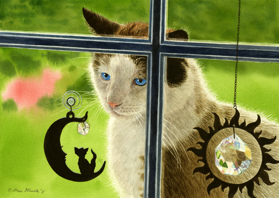 Mister Big's Universe - Fine Art Greeting Card • Hand mounted Art Print on 5" x 7" folded white card stock. • Blank inside. • Matching envelope and clear protective packet included. Image depicts a cat art painting of a lovely mixed breed Siamese cat looking in through a window at a suncatcher from outside