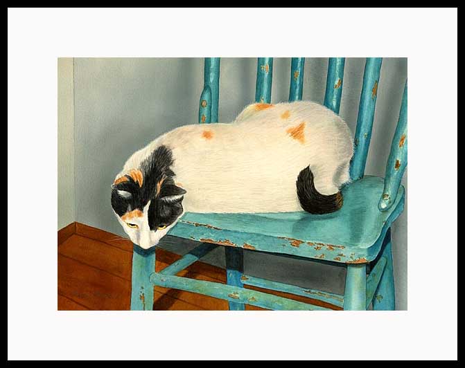 Miss Daisy Framed Limited Edition of an original Drew Strouble cat art watercolor painting of a curious white Calico cat on a teal blue chair. Limited Edition of: 950 Prints • Overall size: 14 1/2" x 18" incl. 2 1/2" mat. • Each print is hand signed, titled & numbered with matching Certificate of Authenticity. All prints are shrink wrapped with a white mat and foamcore backing. Designer Frames are black aluminum with plexiglas.