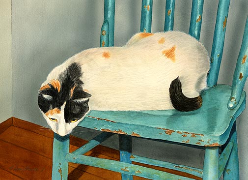 Miss Daisy Matted Limited Edition of an original Drew Strouble cat art watercolor painting of a curious white Calico cat on a teal blue chair. Limited Edition of: 950 Prints • Overall size: 14 1/2" x 18" incl. 2 1/2" mat. • Each print is hand signed, titled & numbered with matching Certificate of Authenticity. All prints are shrink wrapped with a white mat and foamcore backing.