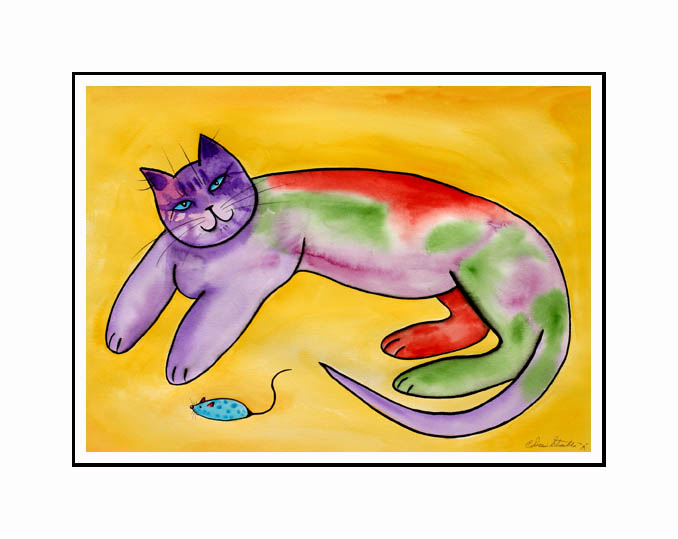 Matted Artist's Proof of an original Drew Strouble cat art painting of wonderfully whimsical and very colorful cats. Limited to 50 Artist's Proofs. Overall size: 14 1/2" x 18" incl. 2 1/2" mat. Each print is hand signed, titled & numbered with matching Certificate of Authenticity. All prints are shrink wrapped with a white mat and foamcore backing.