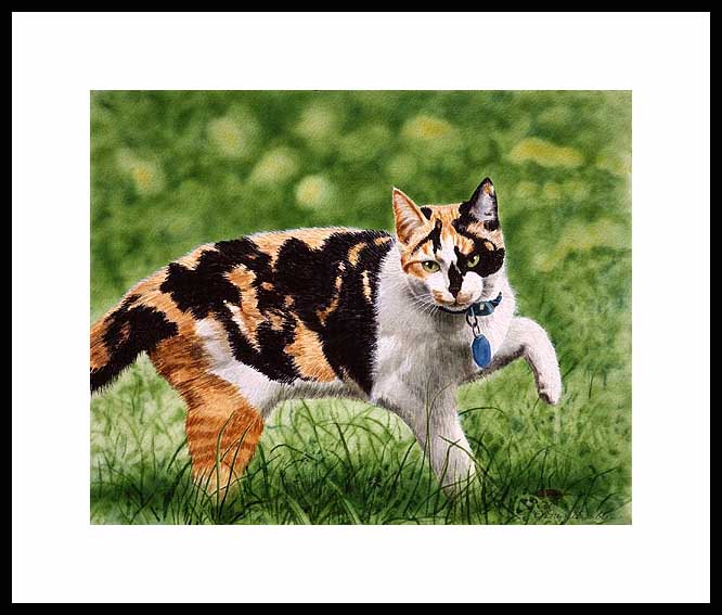 Morning Dew Framed Limited Edition of an original Drew Strouble cat art watercolor painting of a colorful calico out for her morning walk. Limited Edition of: 950 Prints. Overall size: 14" x 16 3/8" incl. 2 1/2" mat. Each print is hand signed, titled & numbered with matching Certificate of Authenticity. All prints are shrink wrapped with a white mat and foamcore backing. Designer Frames are black aluminum with plexiglas.