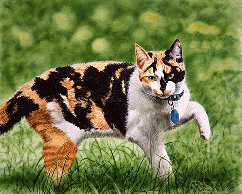 Morning Dew Matted Artist's Proof of an original Drew Strouble cat art watercolor painting of a colorful calico out for her morning walk. Limited Edition of: 50 Artist's Proofs. Overall size: 14" x 16 3/8" incl. 2 1/2" mat. Each print is hand signed, titled & numbered with matching Certificate of Authenticity. All prints are shrink wrapped with a white mat and foamcore backing.